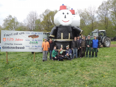 Feuerwehrmännlein an der B22 Am Samstag 2. Mai 2015 wurden zwei Feuerwehrstrohmännlein auf der Wiese von Reinhard Hammer gebaut, die in den nächsten 3 Wochen bis zum Jubiläum fleißig Werbung machen sollten. Aus mehreren Strohballen, Silofolie, Klebehand, Mörtelwannen usw. baute man innerhalb weniger Stunden die 2 Männlein auf. |