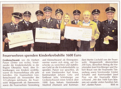 "Gott zur Ehr, dem Nächsten zur Wehr" Feuerwehr spendet 500 Euro für "Lichtblicke" (es) "Gott zur Ehr, dem Nächsten zur Wehr", das Motto der Feuerwehren praktizierten am Sonntag die Spritzenmänner von Großenschwand auf ungewöhnliche Weise: Sie überreichten Schirmherrin Elisabeth Wittmann für die Aktion "Lichtblicke" einen Scheck über 500 Euro. "Beim Jubelfest im Sommer gab es keine Erinnerungsgeschenke. Wir beschlossen, das Geld zu spenden", sagte Vorsitzender Karl Kraus. Aufmerksam lauschten mit ihm Kommandant Hans Götz und Festbraut Julia Schönberger, als Wittmann erzählte, wofür die Spenden verwendet werden. Häufig sei umfassende Hilfe notwendig: "Wir zeigen auf, welche anderen Möglichkeiten es noch gibt." Bei "Lichtblicke" arbeiteten alle ehrenamtlich, daher könne das Geld zu 100 Prozent weitergegeben werden. Bild: es